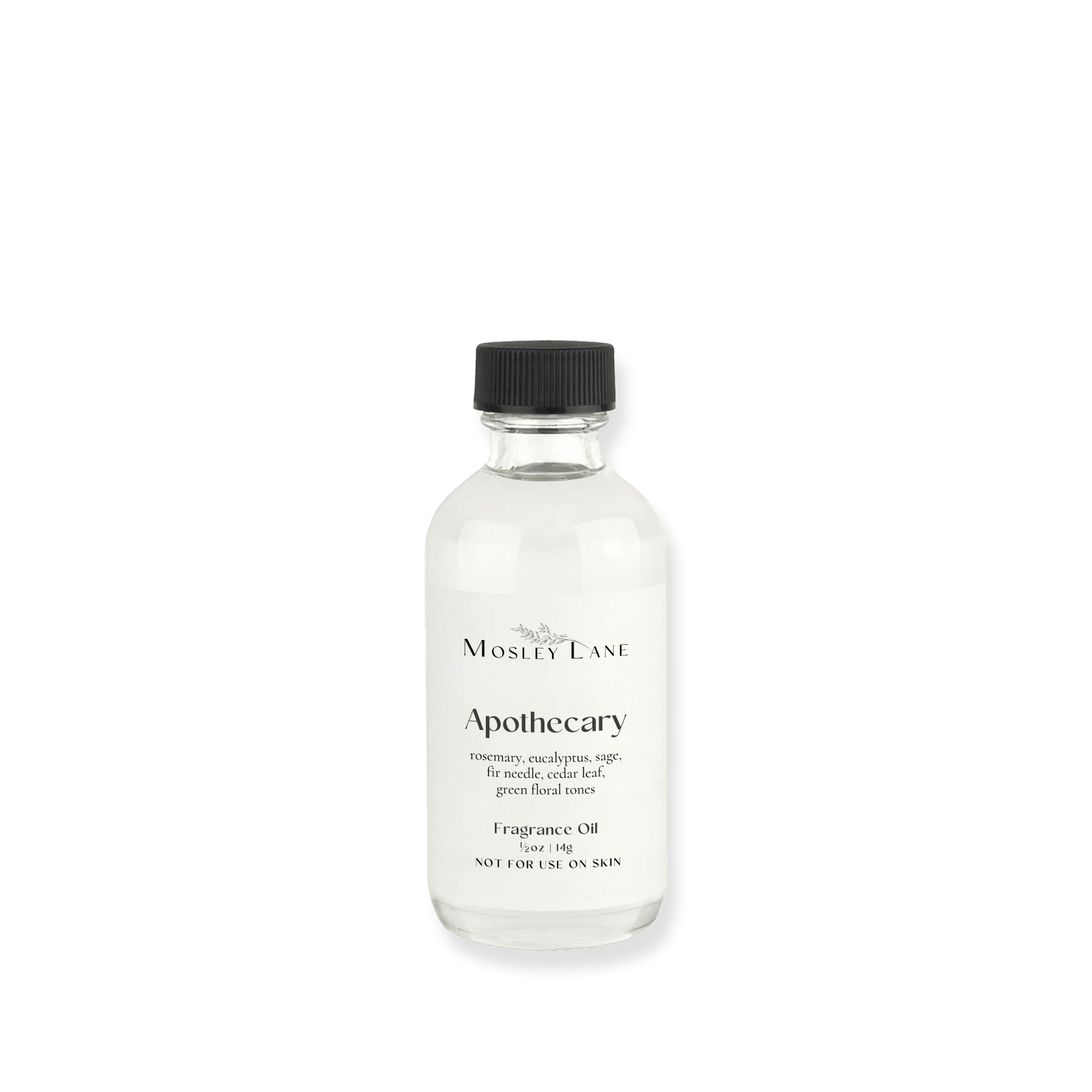 White or kraft label media with black font. The label text will display the Mosley Lane logo, fragrance name, notes, contents, and net weight.