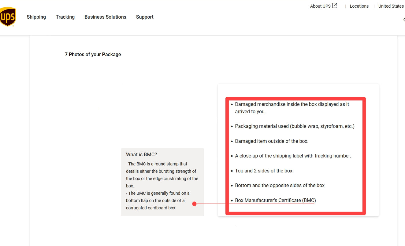 For your reference, here’s a screenshot from UPS outlining the required documentation for submitting a damage claim.
